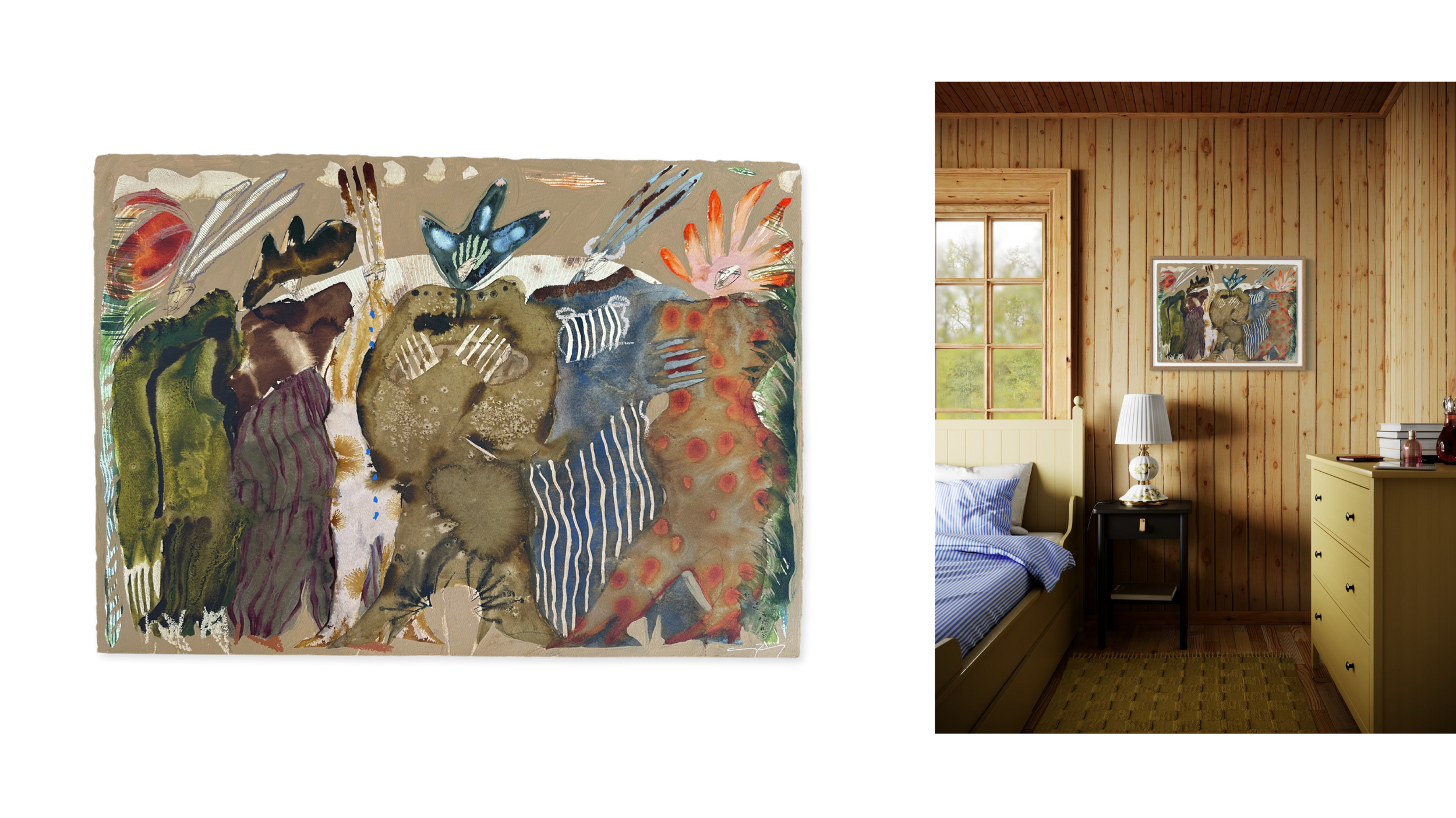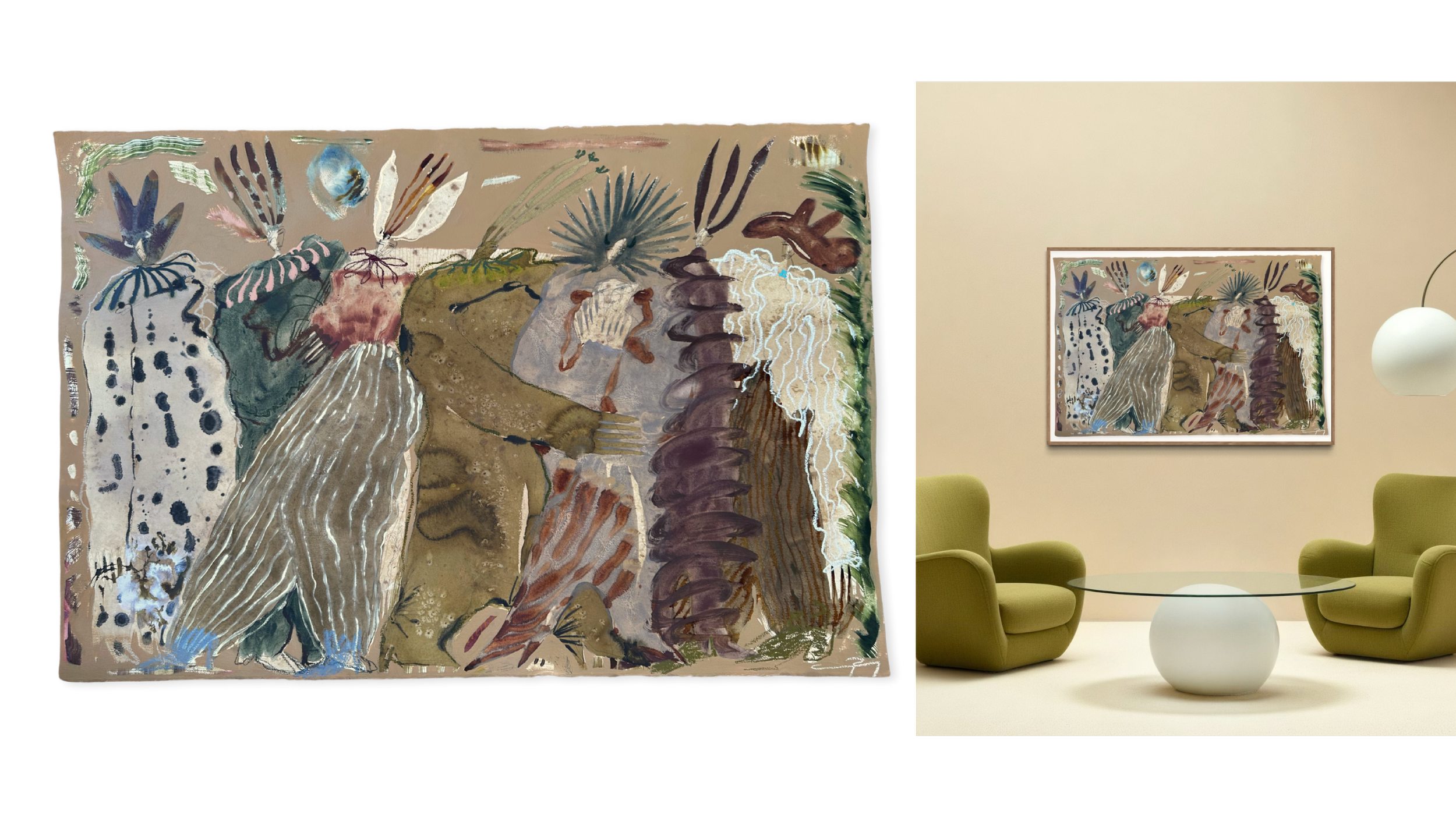 29.5 x 41” ; Acrylic, ink, watercolor, coffee + oil stick on 300lb cold-pressed paper