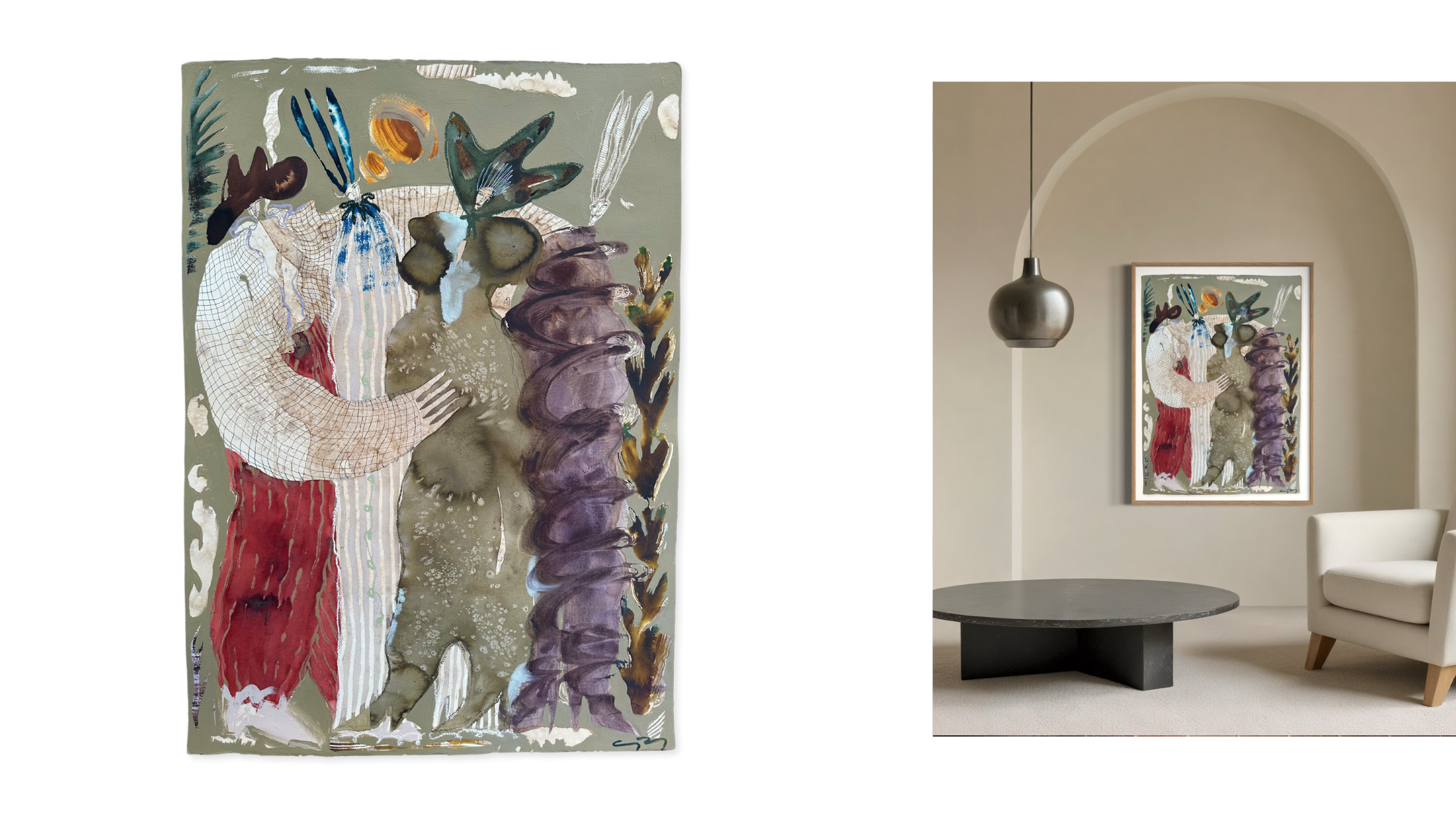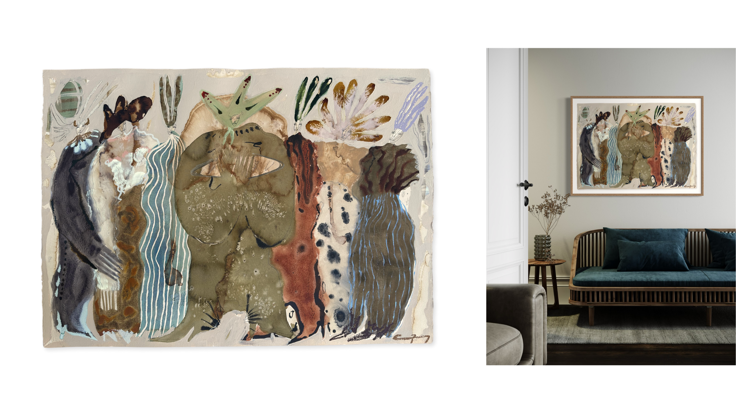 These paintings involved more experimenting than I’ve employed in past collections. With a baby on the way, I felt eager to hole up in my studio and attempt to translate the chaos and nuances of pregnancy into visual works…my last private collection before I’m a mother. Nods and love notes to my independence, autonomy, and baby are in here, too. You may notice more detail, texture, and a fresh take on my figures and palette in these pieces.
