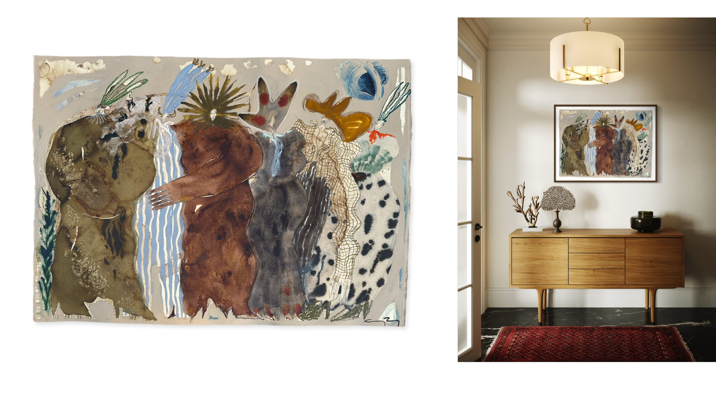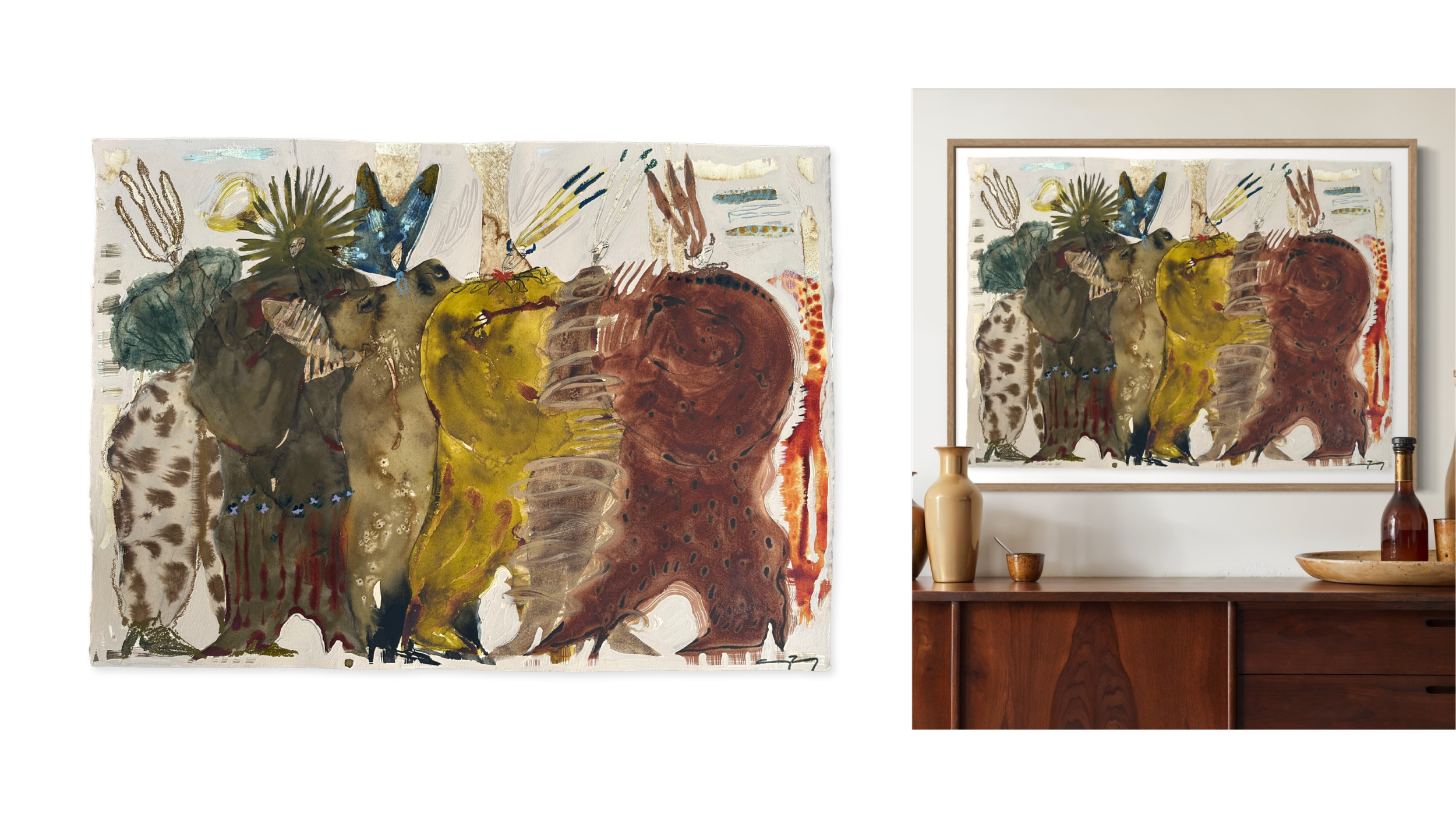 41 x 29.5” ; Acrylic, ink, watercolor, coffee, charcoal + oil stick on 300lb cold-pressed paper